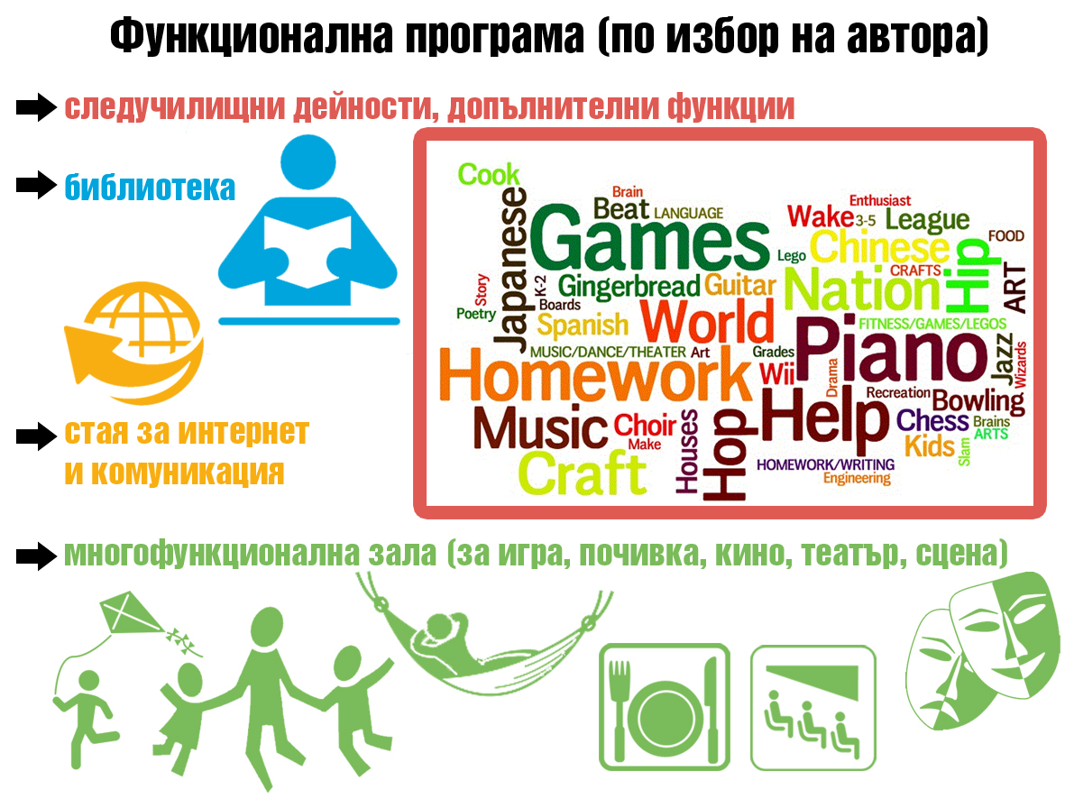 В заданието на конкурса е предложена незадължителна функционална програма, която може да бъде използвана от участниците в конкурса, да бъде променена и/или обогатена с функции. Предложените функции са следните: 1) следучилищни дейности (на приложената схема може да видите богато разнообразие от подобни функции); 2) библиотека – вероятно задължително пространство за едно училище; 3) стая за интернет и комуникация; 4) Многофункционална зала – може да се използва напр. за игра, почивка, кино, театър, като сцена и др.