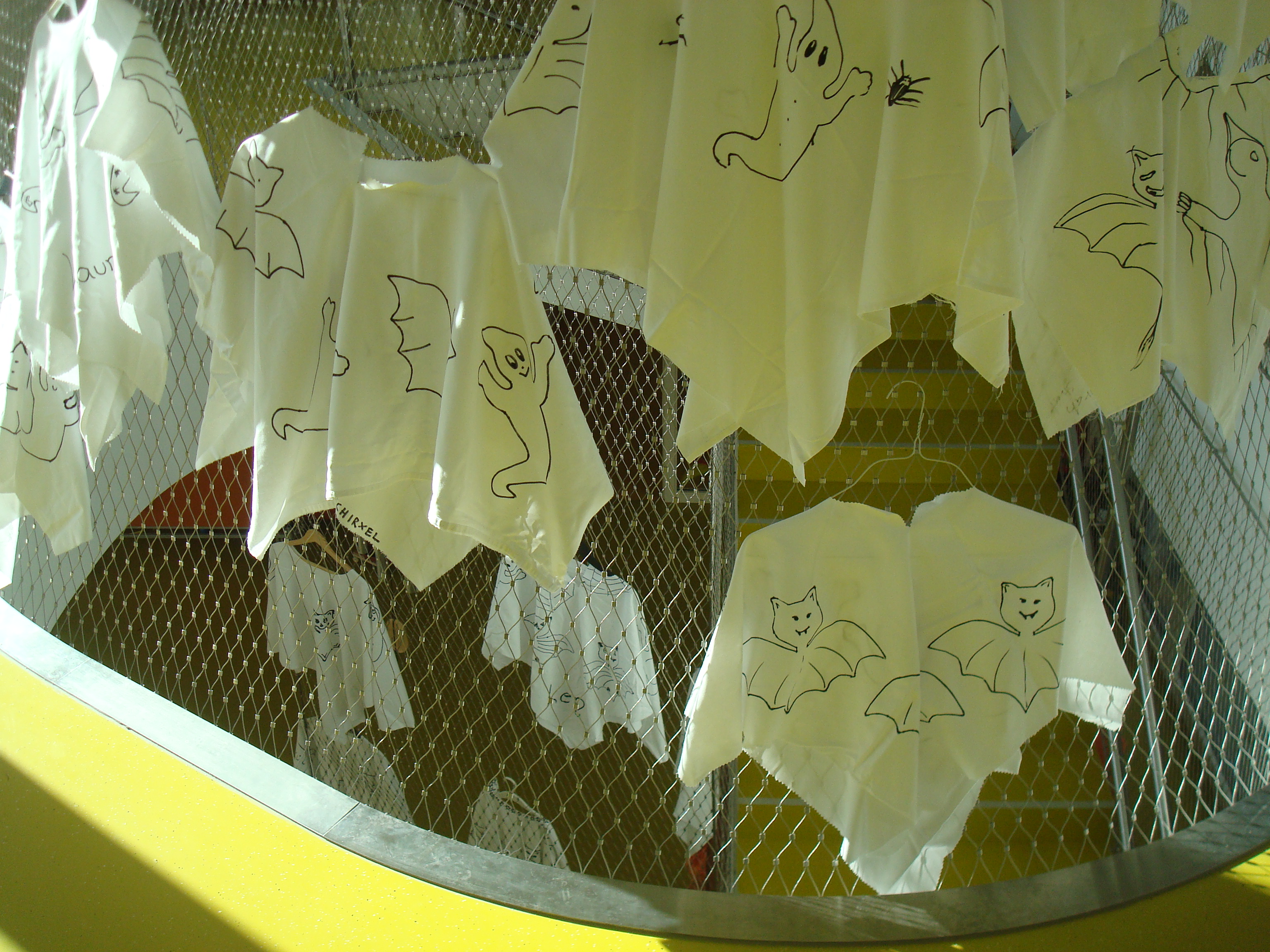 Стълбата е опакована от метална мрежа, с цел безопасност, но и се използва като декоративен елемент – в случая висят на закачалки група от призраци – бели фанелки Published December 10, 2013 at 3072 × 2304 in Back to school / Отново в училище ← Previous Next → Share this:Share Click to share on Facebook (Opens in new window) Facebook Click to share on X (Opens in new window) X Like Loading...