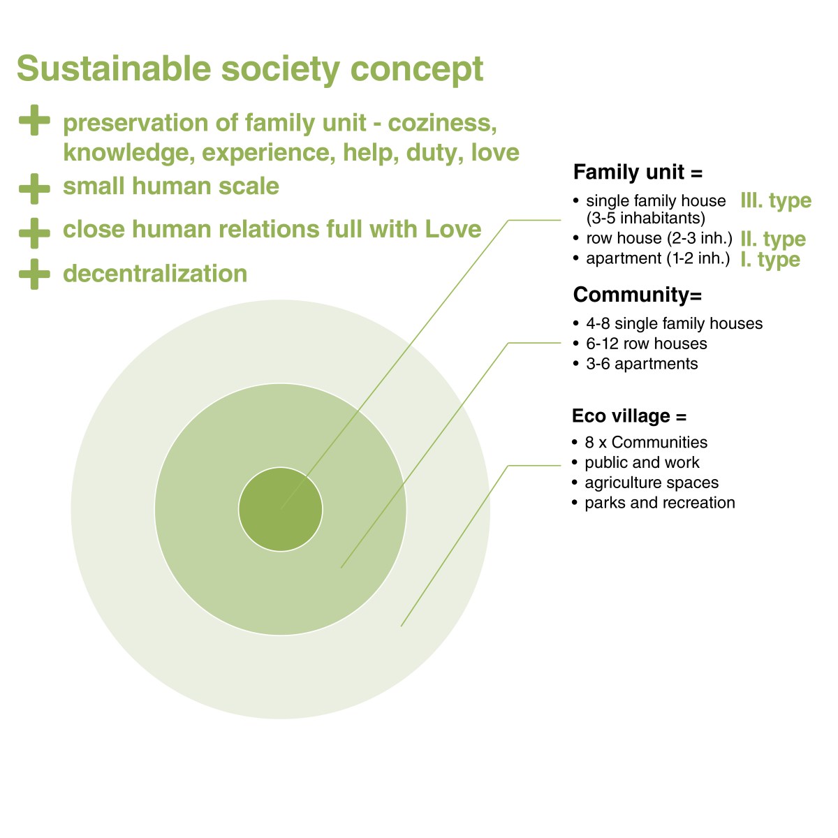 Sustainable society concept is based on the preservation of the family unit and values. A family unit of 3-5 person inhabits a single family house (I. housing type), an unit of 2-3 person inhabits a row house (II. housing type) and an unit of 1-2 person inhabits an apartment (III. housing type). Each community consists of 4-8 single family houses, 6-12 row houses, 3-6 apartments (depending on the community size). The eco village consists of 8 communities.