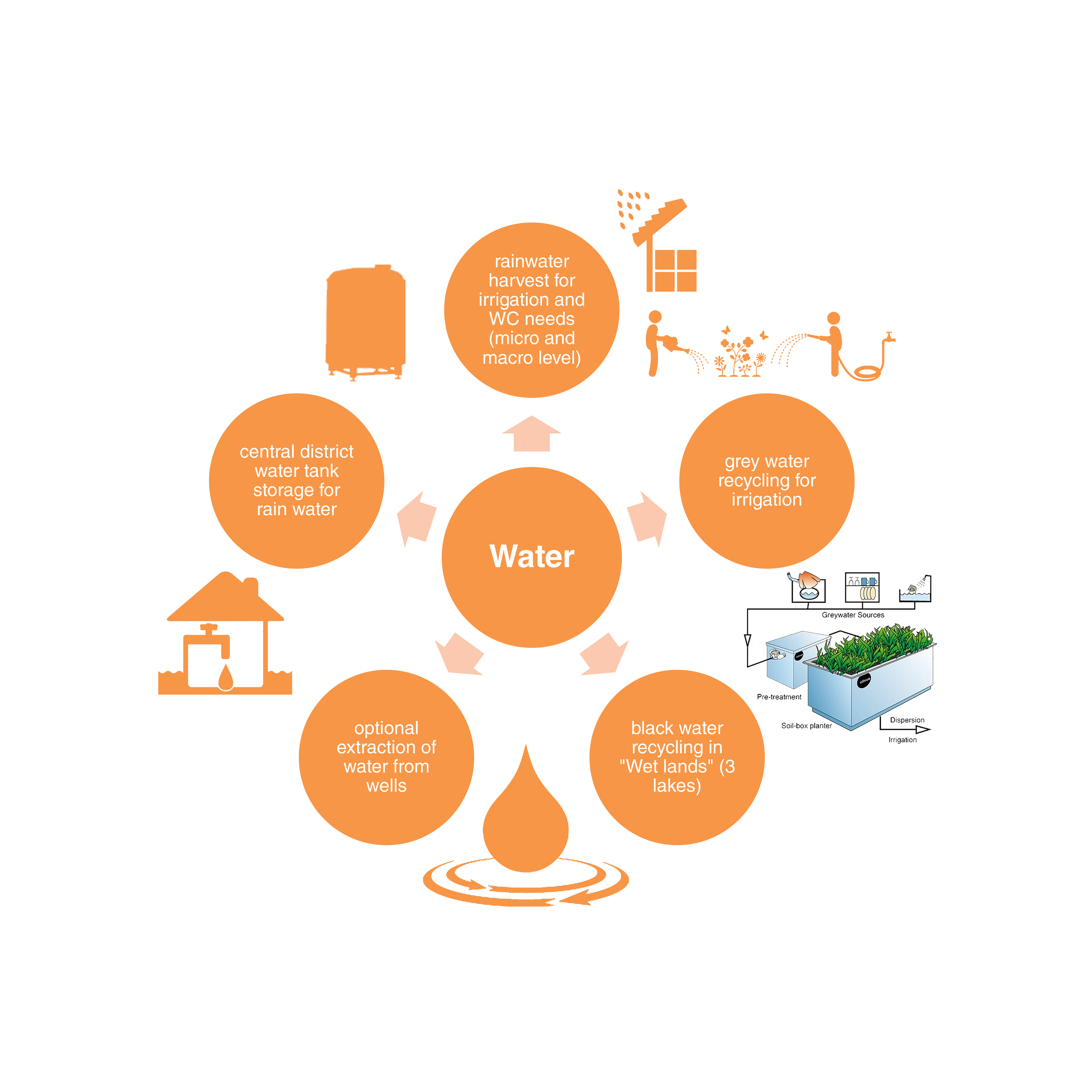 Water: rainwater (local and central) gathering for irrigation and toilet needs; recycling of “gray” and “black” waters; wells for supply of drinking water;