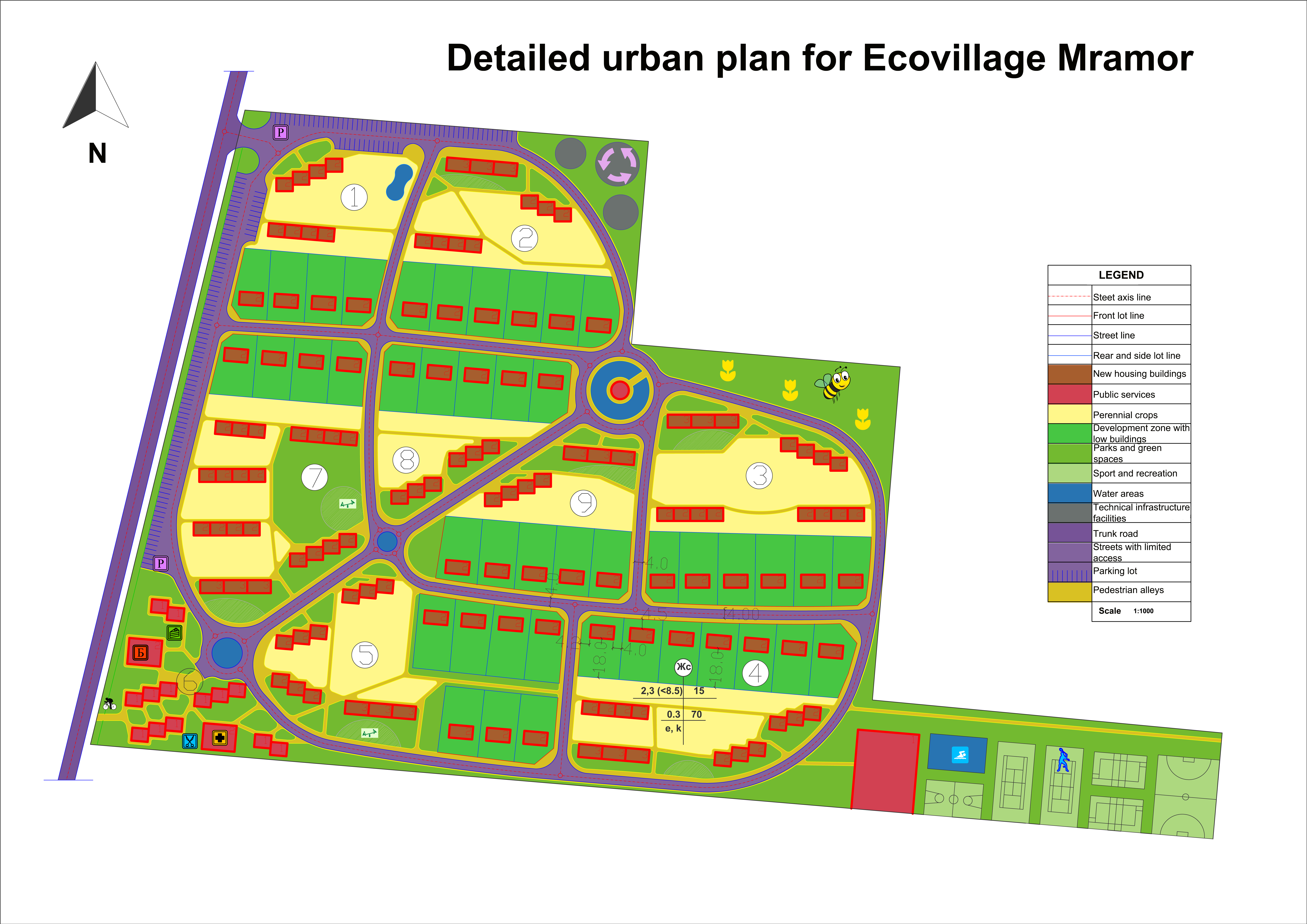 The project area is located on the north of bridge over the river between the villages of Mramor and Dobroslavtsi, which are connected with a road, passing on the west side of the plot. The public access and the public spaces are located on the south-west corner of the area and continues in the form of a diagonal line with two public junctions with green and water zones, which ends with a spiritual building (temple, church, etc), designed on an island, surrounded with water (mirror effect). The public zone consists ofr an info point, library, cultural centre, food shop for the production grown with love in the village (incl. honey, herbs, vegetables, fruits, nuts, etc.), tee house, restaurant for the food production, public kitchen for cooking, crafts working spaces – building, beekeeper, agriculture, ceramics, public laundry, health center and pharmacy, hairdresser, shoe and clothes shop, rent a bike, bank, food shops, public toilet, recreation zones. The accessability of the area is designed. The eight communities are divided in two by the diagonal, created landscape alleys in a form of a heart with chambers. Every community is having a closed open green space, public and agricultural areas. Every community consists of a flexible number of single-family houses, row houses and apartment blocks. The herbs and bees are grown in an closed area, on the north of the houses. The sport and recreation areas are located in the south-east corner of the plot, close to the river. The technical infrastructure (RES power plant, garbage gathering system, hot water storage, rainwater tank) is located on the north-east corner of the plot. The area is insulated from the road with a lifted terrain and trees, planted on it, between the village and the road on the west. On the north side are also planted trees for wind protection.