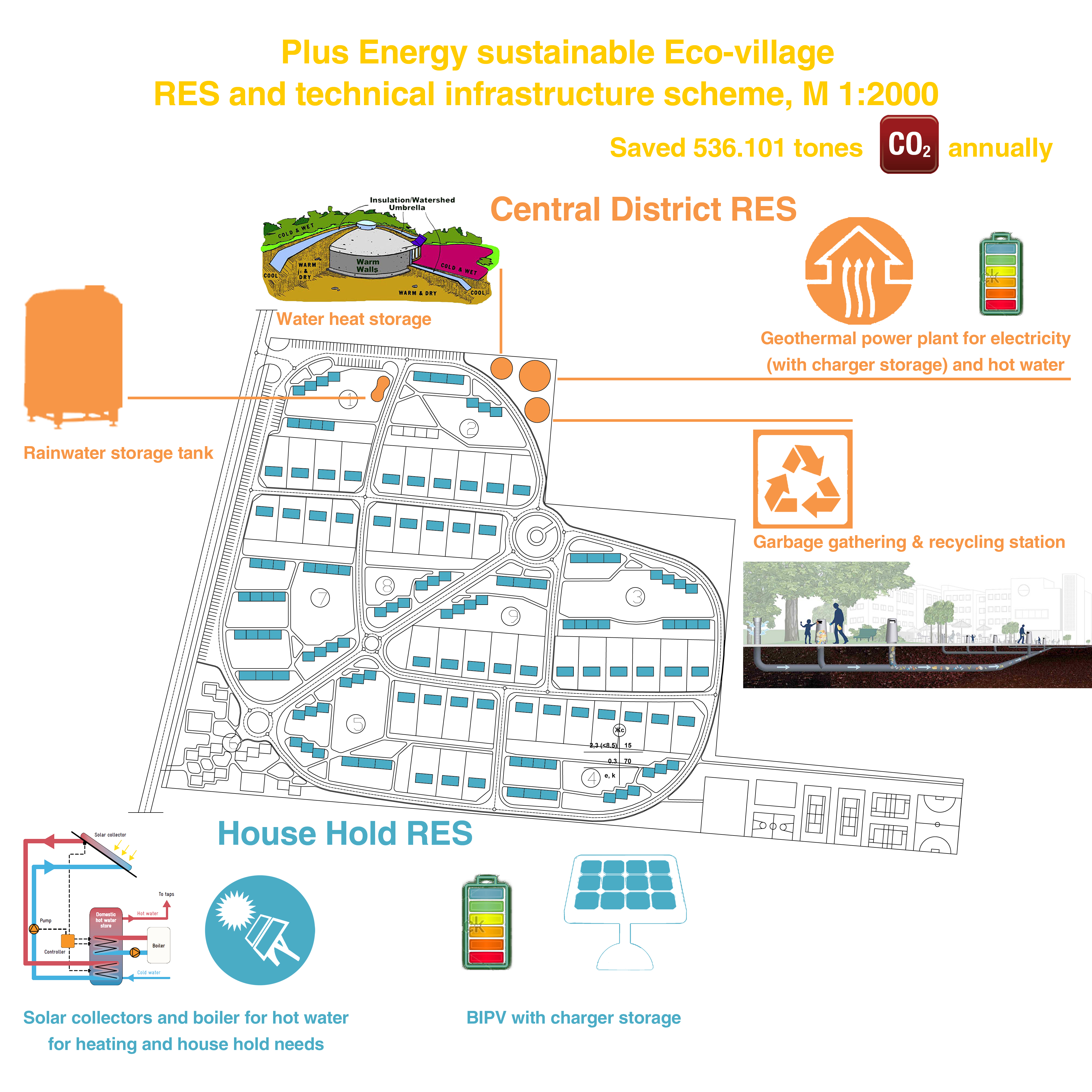 Renewable Energy. Micro RES (in every house): use of BIPV + charger batteries for electricity , solar collectors and boiler for heating. Macro RES (for the whole village): central district heating collector and geothermal power plant for hot water and electricity. Water storage tank for hot water, which will be used in the winter. Rainwater storage tank. Garbage vacuum gathering and recycle/compost system. SAVED CO2 emissions = 536 101 tones/annually.