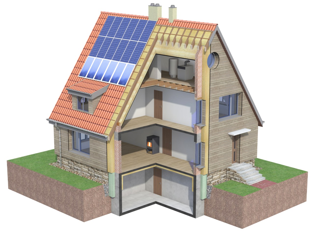 Software with a 3D dynamical animation, showing the amount of energy savings, in case of executing different measures for energy efficiency (mainly with Saint Gobain products): adding roof OR attic insulation (different materials and thicknesses); wall insulation (Compound insulation or Rear ventilated facade); cellar ceiling insulation; changing the windows and the glazing; putting Ventilation, Heating, Solar collector and PV. According to the selection – the typical old style German house is being renovated into a Passive House or even a Plus Energy House, the images and the energy consumption values are also dynimically changing.
