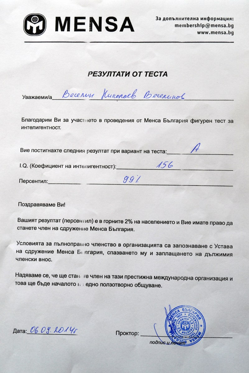 IQ test_Result 156 (in the upper 1%)_Certificate Mensa Bulgaria Published October 13, 2014 at 3072 × 4608 in Awards & References ← Previous Next → Share this:Share Click to share on Facebook (Opens in new window) Facebook Click to share on X (Opens in new window) X Like Loading...